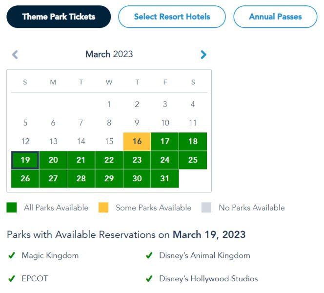 Park pass reservation availability is dependent on whether you’re a guest with theme park tickets, a Disney World hotel guest, or if you’re an Annual Passholder. For visitors with Theme Park Tickets, all four parks are available March 19th-25th.