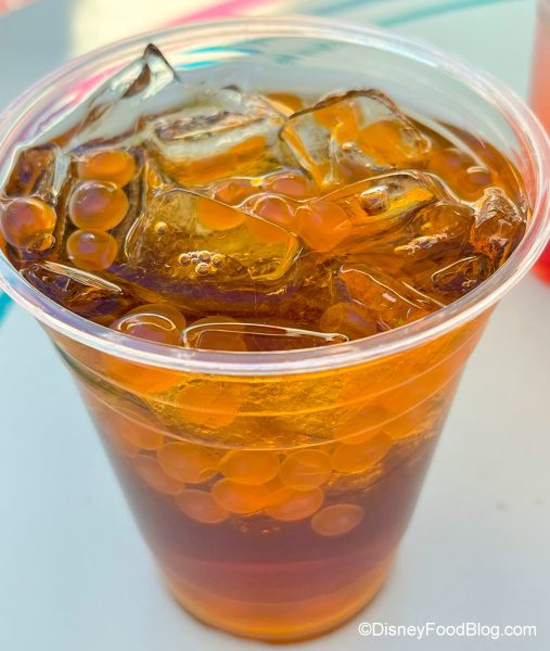 We also sipped on Granny Goof’s Garden Sweet Tea for $6.49, made with Gold Peak Sweet Iced Tea with Honey-Mango Premium Syrup and Mango flavor-filled Spheres. This was our least favorite of the three drinks. It tasted way too artificial for our liking.