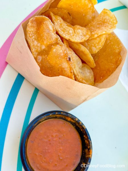 Daisy’s Dressed-Up Dog is an All-beef Foot-long with Chili-Cheese Sauce, Mac n Cheese and Parmesan Potato Crispies, with House-made Chip for $14.49.We had such high hopes for this one, but in the end, it was just “meh.” We thought the crispies added a nice crunch, though, and we did LOVE that chili cheese sauce. The Mac and Cheese wasn’t really anything special, though. The chili cheese sauce is about the only thing that would have us order this again (and you can get that separately anyway, so why bother?).