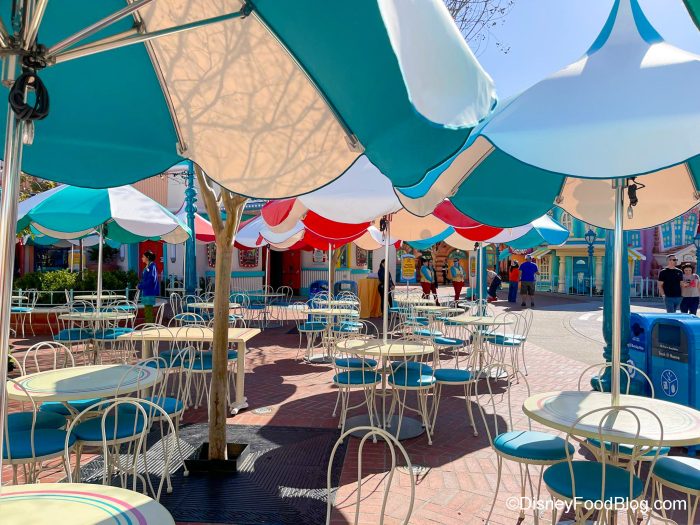 The food here is diner-inspired, so expect things like Pizza Flop-Overs, The Daisy Dog, Daisy’s Dressed Up Dog, and a Spring Garden Wrap. For sides, you can get Toontown ‘Tater Chips, Chili-Cheese Sauce, and Ranch. For dessert, you can get Daisy’s Goody-Goody Donuts. Several specialty beverages, along with soft drinks and water, are also available.