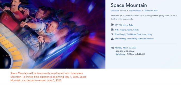 Space Mountain will temporarily transform into Hyperspace Mountain starting May 1st. Space Mountain is expected to reopen (and be back to its “usual” form) on June 5th, 2023.