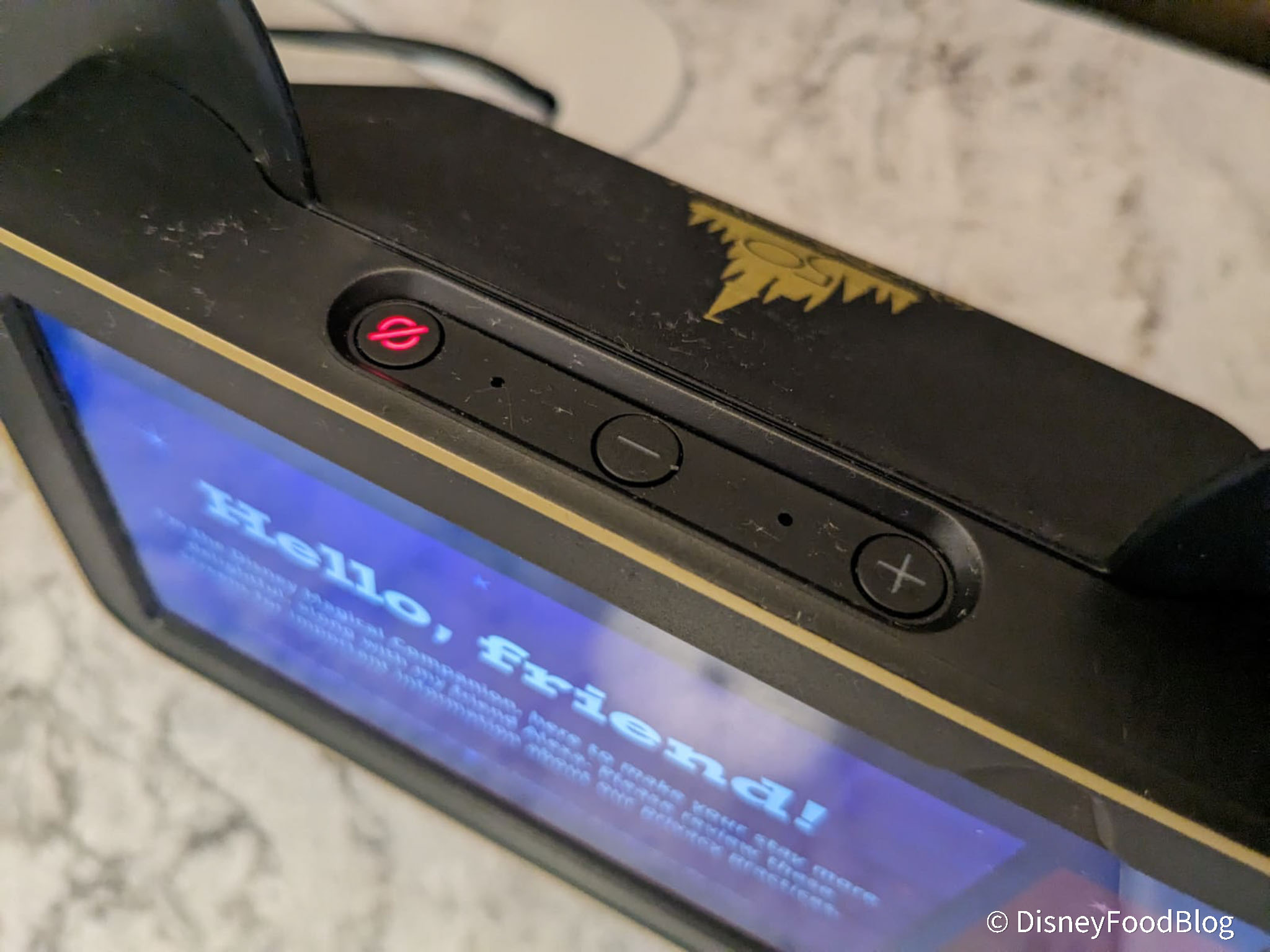 Want to dive right into using “Hey, Disney!” when it becomes available in hotels rooms throughout the Resort? The top of the device will have a button that looks like this: ⊘ and upon arrival it should be red (the device is muted). Simply press the button to unmute it and use the smart speaker. To start using the “Hey, Disney!” device, guests may touch the interactive screen (tap “Hey Disney, start the magic!”), or say one of the wake words: “Hey Disney” or “Alexa.”
