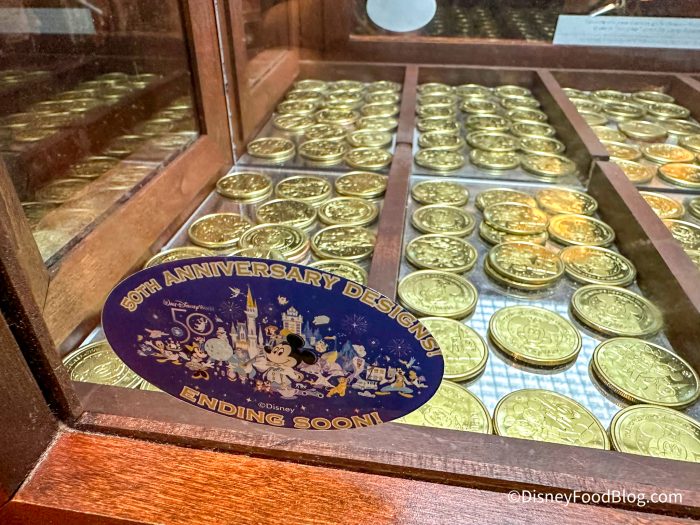 We noticed that one 50th Anniversary collectible could be going away soon! At Magic Kingdom, we saw that these 50th anniversary medallions are going to be removed at the end of the ceelbration. A sticker on the medallion machine announced that the 50th anniversary design is ending soon.