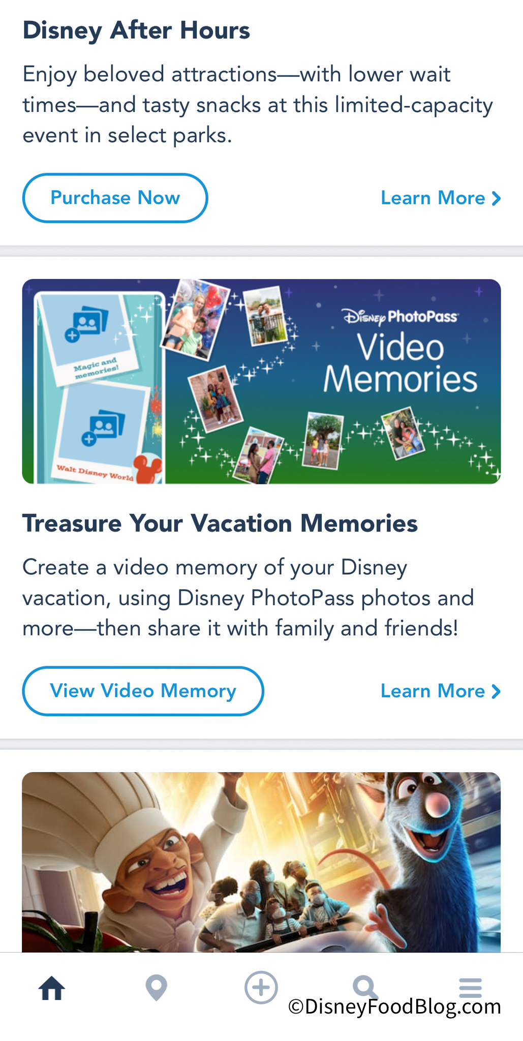 The new feature on the My Disney Experience app is called Video Memories. According to Disney, guests can now create videos using PhotoPass photos and more to revisit their magical vacation at home. In order to create yours, open the My Disney Experience app on your phone (to the home page) and scroll down until you see Video Memories.