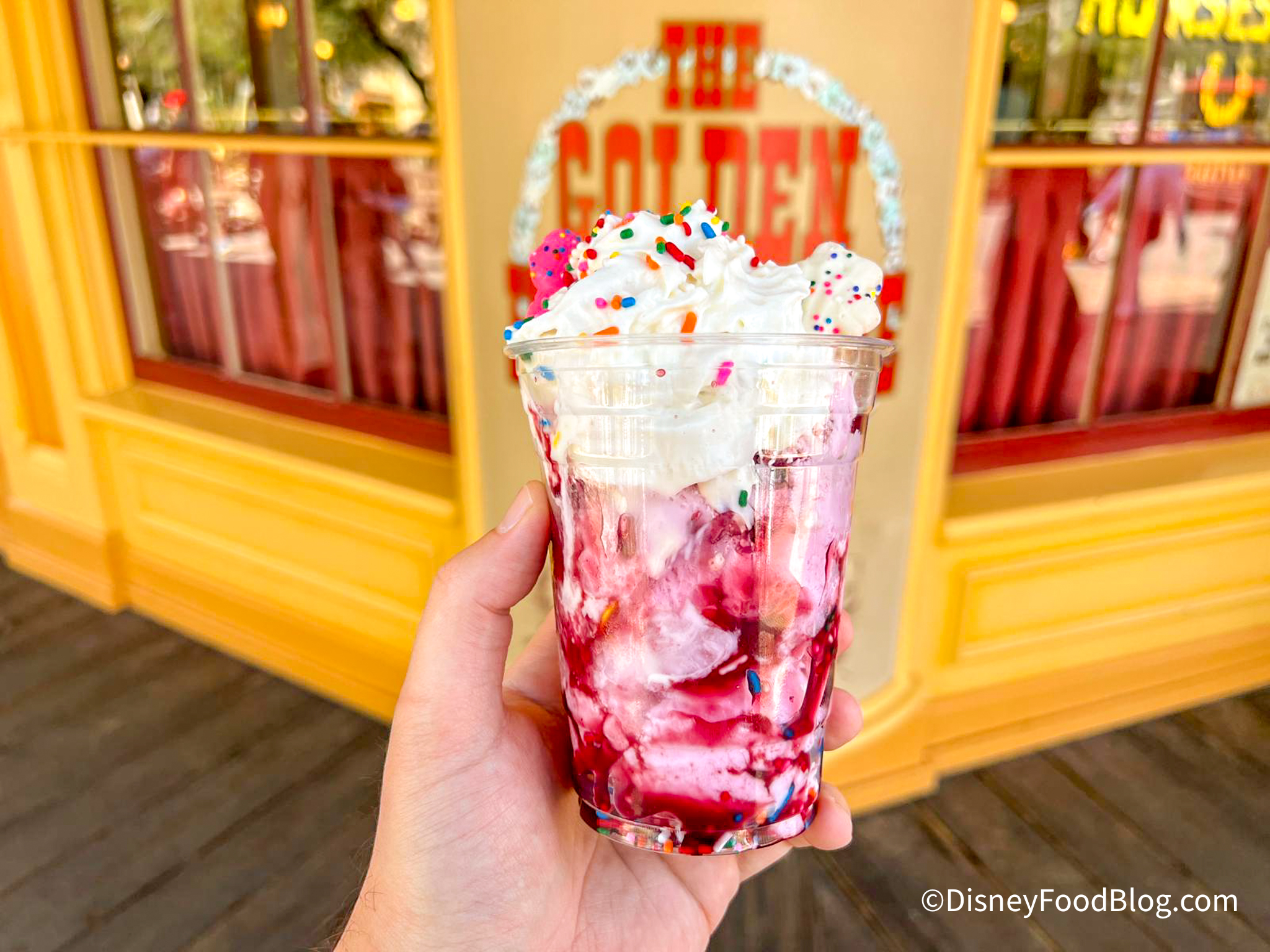 Over at The Golden Horseshoe, we found the Strawberry Sprinkle Sundae. This seasonal treat features Strawberry Ice Cream, Raspberry Drizzle, Rainbow Sprinkles, and Iced Cookies.