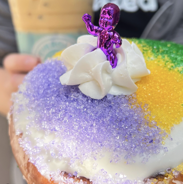 The King Cake Cinnamon Roll is a vanilla iced cinnamon roll topped with vanilla buttercream frosting and purple, yellow, and green sugar. Of course, it comes with a King Cake baby on top (which is NOT edible).