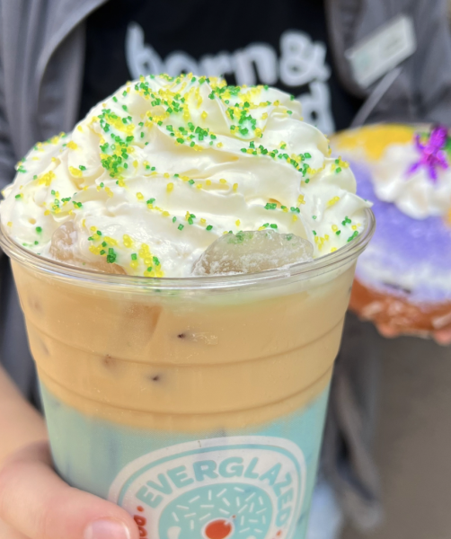 The King Cake Iced Coffee features Everglazed’s everyday blend coffee with cinnamon bun syrup, caramel, sweet cream foam, and Mardi Gras sprinkles.