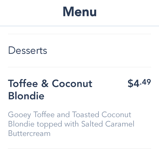 However, is it REALLY gone? Because when we took a look at the latest Fairfax Fare menu, we noticed a “new” snack. The Toffee and Coconut Blondie is described as a “gooey toffee and toasted coconut blondie topped with salted caramel buttercream.” The price remains the same at $4.49.