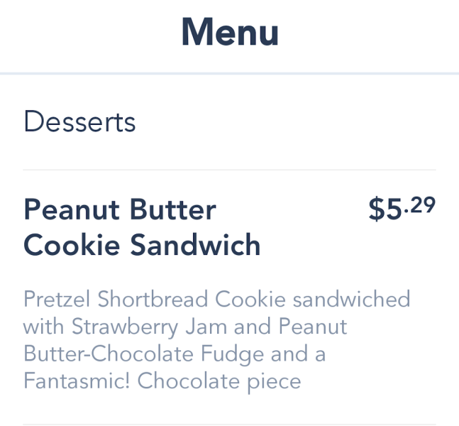 It’s made with strawberry jam and peanut butter-chocolate fudge on a pretzel shortbread cookie. Well, it looks like it’s being renamed to the Peanut Butter Cookie Sandwich, and getting a Fantasmic! chocolate piece added to it. Hint: we weren’t big fans of it when it was 50th anniversary-themed, but it’s worth a try.