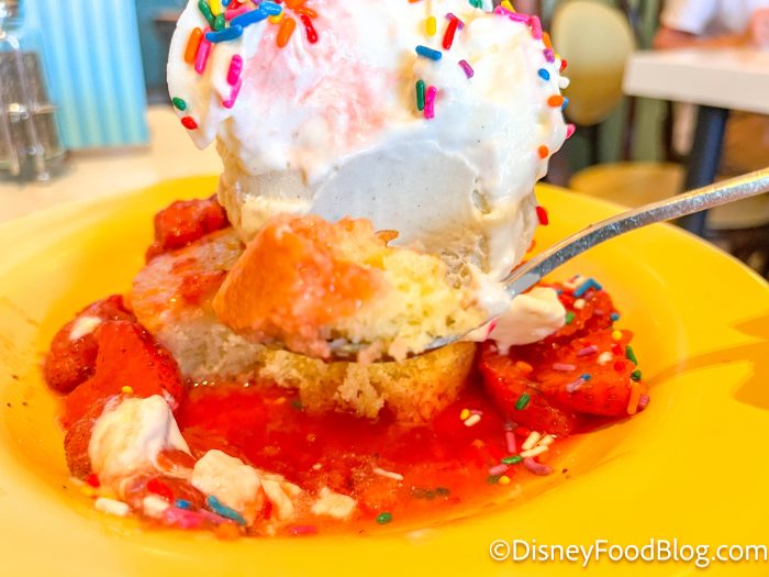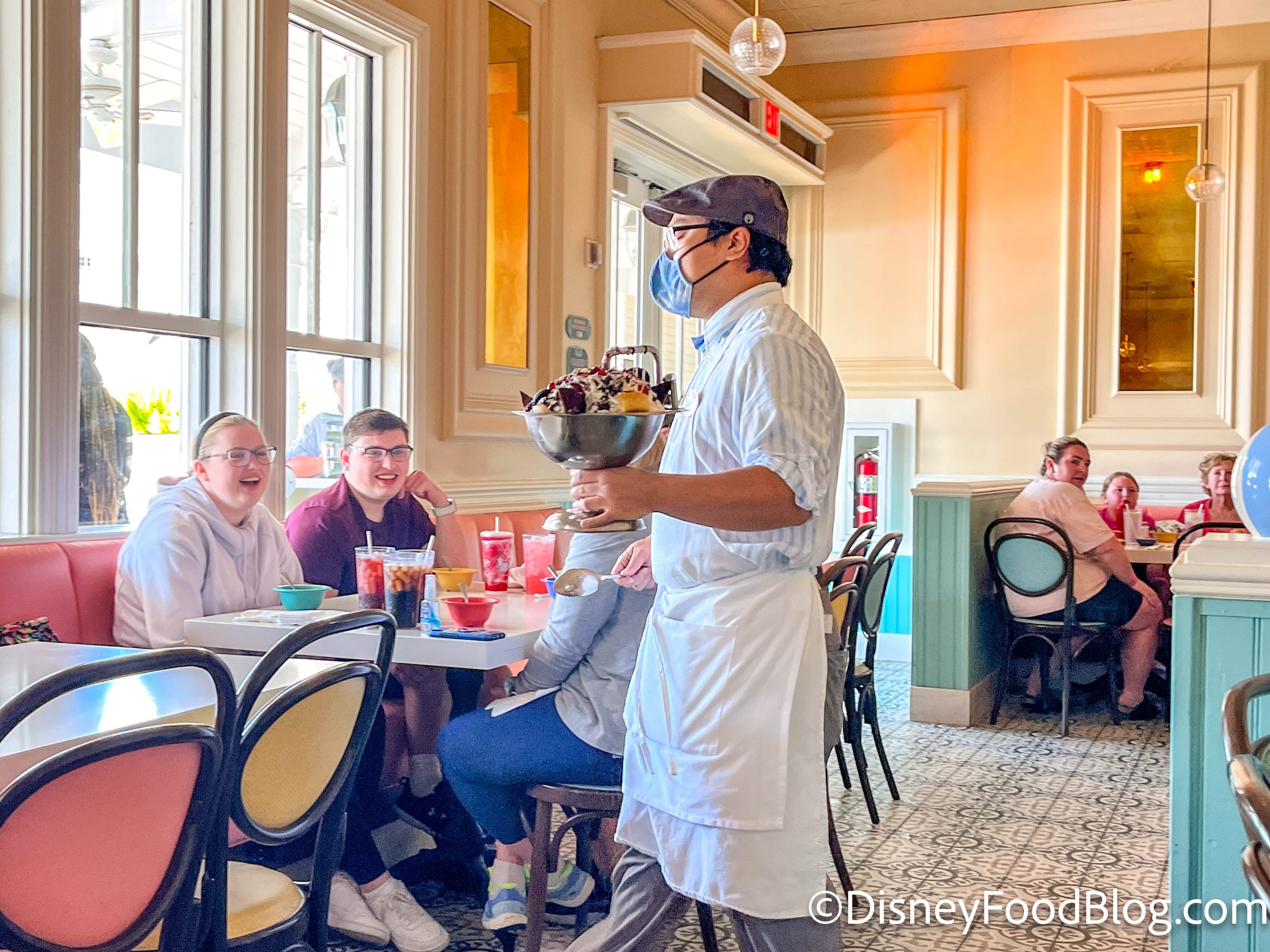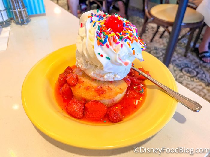 Lights on the ceiling will start flashing and a Cast Member will come out holding the sundae, announcing it to the entire dining room. (Did you know it comes with a WHOLE CAN of whipped cream on top?!) It’s really fun detail that sets this restaurant apart.