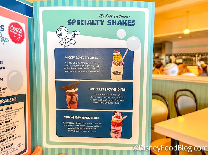 But the real kicker here is dessert. Besides the Kitchen Sink we mentioned earlier, they also have several smaller sundaes (although they’re definitely not small!), milkshakes, floats, and malts. Flip to the Specialty Shakes section of the menu to see which over-the-top milkshake creations you can order.