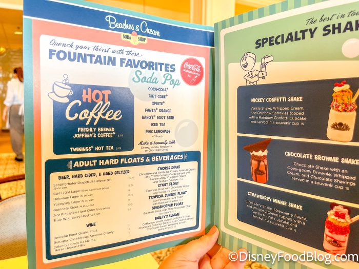 The menu here is filled with classic diner-style food as well as a large selection of ice cream treats. You can start your meal out with one of the “fountain favorites” or a hot coffee, and they also have adult beverages to choose from.