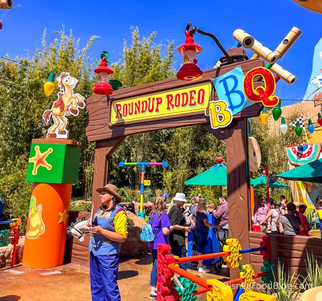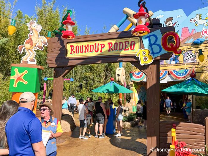 Greetings from Hollywood Studios! We’re here to check out the opening day of Roundup Rodeo BBQ in Toy Story Land, and trust us — we’re ready for some barbecue. But apparently, we weren’t the only ones! As we headed into Hollywood Studios, we noticed a steady stream of people trickling in, but nothing too out of the ordinary considering we got there in the morning as others arrived.