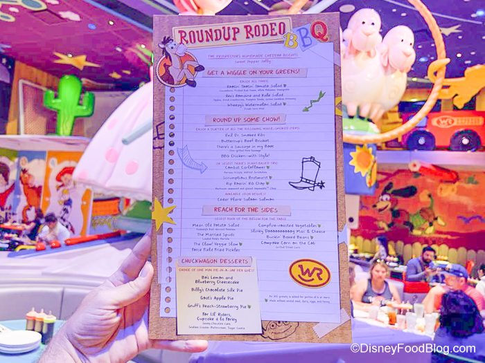 The feast here is $45 per adult and $25 per child (ages 3-9) — the same pricing for lunch and dinner. When we ate here on opening day, we were told by our server that right now, Roundup Rodeo BBQ is not accepting discounts of any kind. This could change in the future, and we’ll keep you updated!