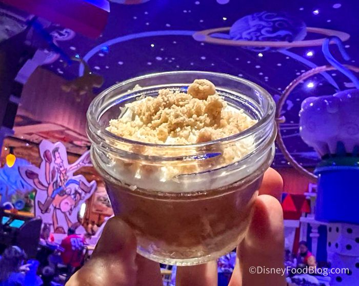 The Cupcake a la Forky might be geared toward kids, but we loved it too. This is a classic chocolate cake with a gooey chocolate ganache center topped with velvety graham cracker buttercream and a sugar cookie. It was very sweet, but also a little basic. It sort of reminded us of the kind of cupcake you can pick up in any grocery store.