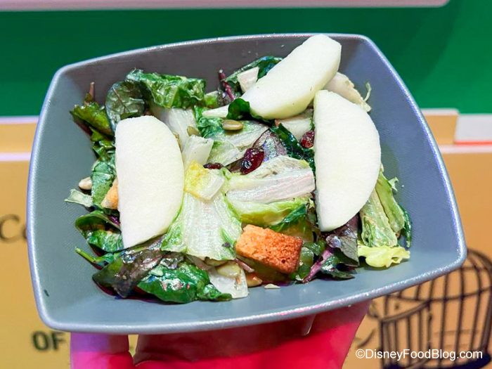 Next, we tried some of the salads, starting with Rex’s Romaine and Kale Salad. It’s made with Apples, Dried Cranberries, Pumpkin Seeds, and Green Goddess Dressing. This was our least favorite of the three salads, but it was still pretty good. We wish there had been a bit more dressing, but we enjoyed the apples as they added a fruity crunch. The kale was soft and tender, and the pumpkin seeds added a nice saltiness. It was balanced but very earthy.