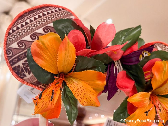 Here’s a closer look at the ears — they have a Moana-inspired pattern on them, and each ear is outlined with orange trim. There are orange, purple, and red flowers, along with some pretty greenery that really makes those flowers pop.