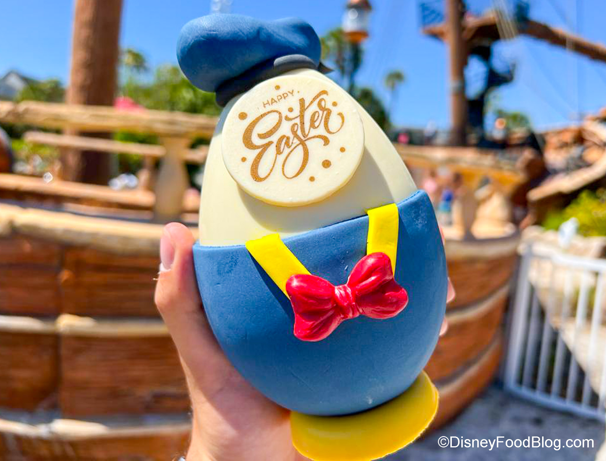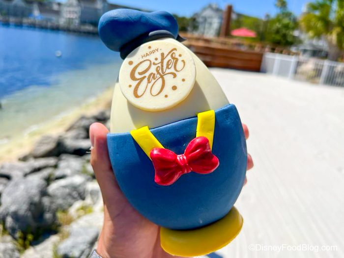 Here’s the thing: this egg is AMAZING to look at because it’s iconic Donald Duck. It’s also sturdier than a lot of chocolate items — it didn’t melt in the sun on us and the mold stays firm. The taste is pure white chocolate (and we know not everyone loves that, so be warned). The fondant, though, tastes like we imagine Play-Doh would taste — it’s safe to say we were not fans of that part.