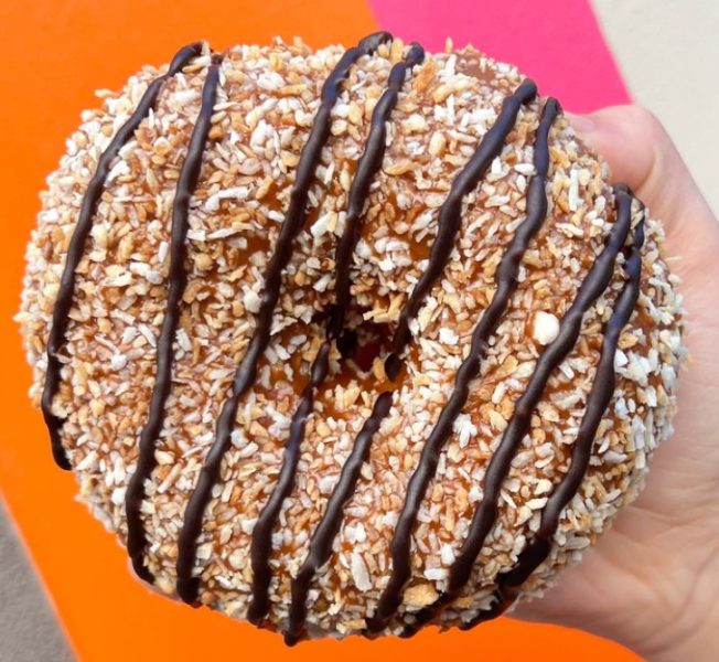 Everglazed just unveiled a brand new donut making its way to the permanent menu. It’s called the Coconut Delight, and yes, it sounds like one of our favorite Girl Scout cookies — Samoas. It’s Everglazed’s traditional glazed donut iced with caramel and then dipped in coconut shavings and drizzled with chocolate syrup.Â
