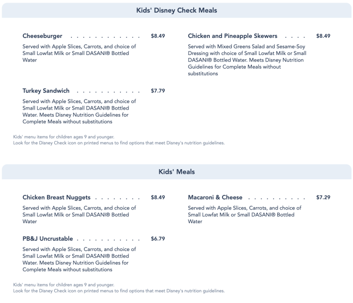 For kid’s meals, there are some classics like Chicken Breast Nuggets or Macaroni & Cheese, as well as some Disney Check Meals like the Chicken and Pineapple Skewers for a healthier option.