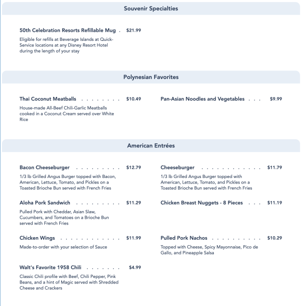 Capt. Cook’s has a pretty large selection on their menu, starting with the 50th Celebration Resorts Refillable Mug, Polynesian Favorites like the Thai Coconut Meatballs, and American Entrees.