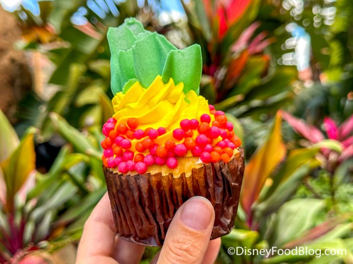 Lastly, we tried a new-ish dessert on the menu — the Pineapple Cupcake for $6.49. This was added to the bakery lineup recently to replace the 50th Celebration Cupcake (quite a few 50th anniversary items have gone missing from Disney World lately!). But we wanted to give this new cupcake a shot. This is a Vanilla Cupcake with a DOLE Whip® Pineapple Cheesecake center, Pineapple Buttercream, and White Chocolate Décor.