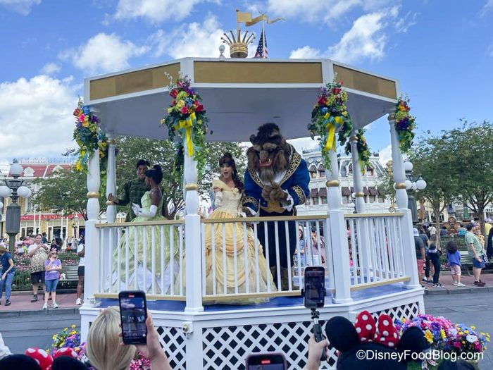 Okay, so we’ve seen things missing from the parade before. At one point, Maleficent in her dragon form didn’t appear in the parade for a while after a technical problem. But today, we noticed something different. So usually, the first float that appears in the parade is the one with Belle and Beast on one side…