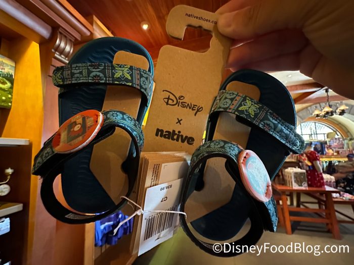 They’re velcro sandals with an orange Hei-Hei button on the top strap.