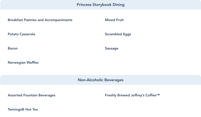 The meal is known as “Princess Storybook Dining” and while the website doesn’t specify if this meal is buffet or family-style, we know that the restaurant was family-style when it reopened in 2022, so it seems that it will remain that way for breakfast. This means that you’ll pay all one price and get food for the table.
