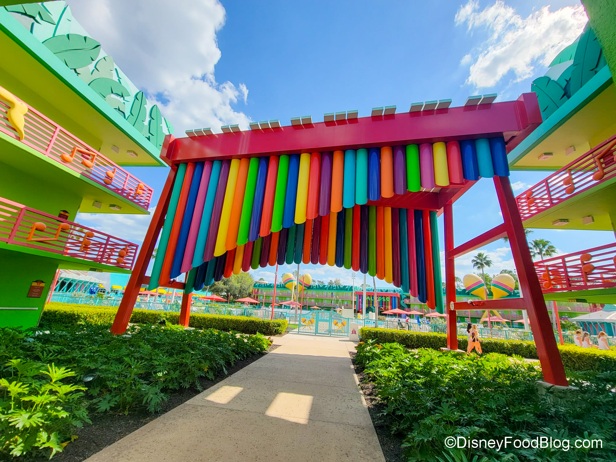 Outside is much more bright and colorful! Each area at All-Star Music is themed after a different genre: Country, Broadway, Jazz, Rock and Calypso. The decorations are perfectly suited to the theme and include massive maracas, a giant xylophone, and so much more.