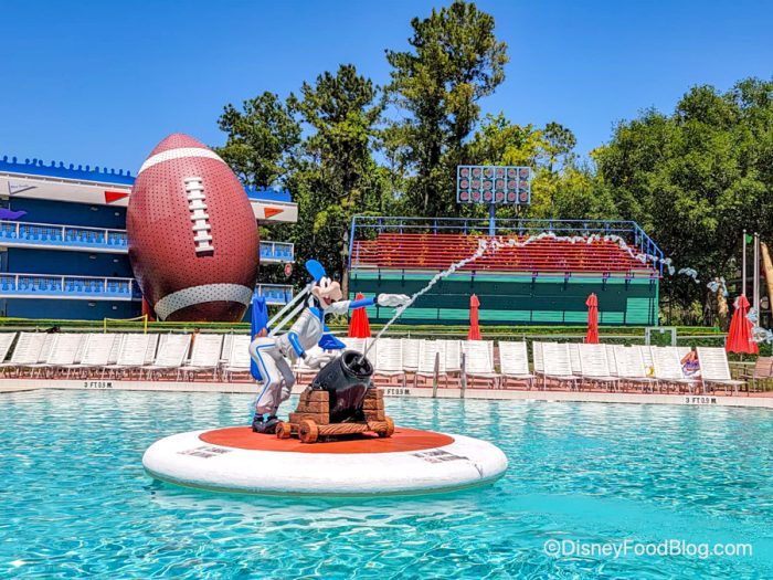 Goofy makes an appearance at the Grand Slam Pool! At the Grand Slam Pool, he’s taking the pitcher’s mound except this time he has a cannon full of water and it’s aimed right at the swimmers! One of the unique aspects of this pool is the sundeck, which is designed to look like an outfield. There are even giant baseball bats lining the pool area!