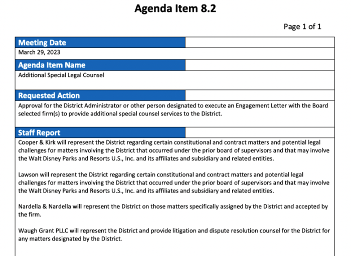 The agenda specifically discusses two legal firms that could be used to represent the District regarding “potential legal challenges for matters involving the District that occurred under the prior board of supervisors and that may involve the Walt Disney Parks and Resorts U.S., Inc. and its affiliates and subsidiary and related entities.”