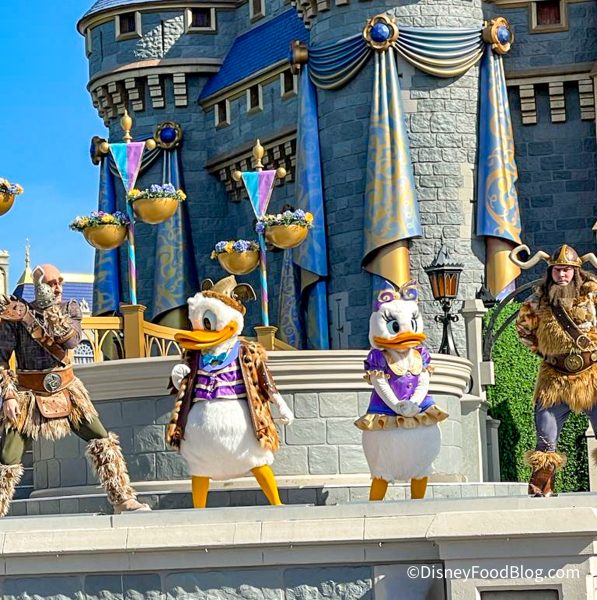 Donald and Daisy both sported new costumes as well. Daisy has a purple, blue, and gold dress with a matching bow. Donald was wearing his Viking jacket and hat during one part of the show with a blue and purple button vest as his main outfit. Check them out.