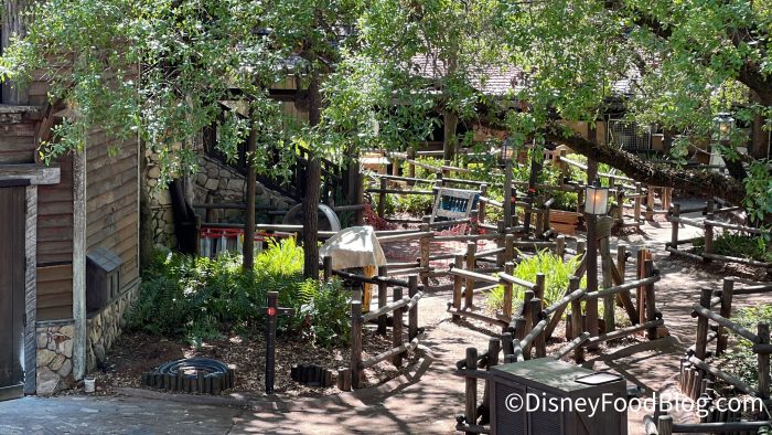 The outside queue area has had the most visible changes. It started with the removal of the birdhouses, tagging, and collection of the previous Splash Mountain interior queue items, and even some painting. It also has served as storage for various equipment.
