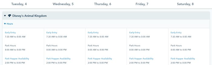 Park hours for Animal Kingdom are from 8AM-8PM on April 2nd-6th…