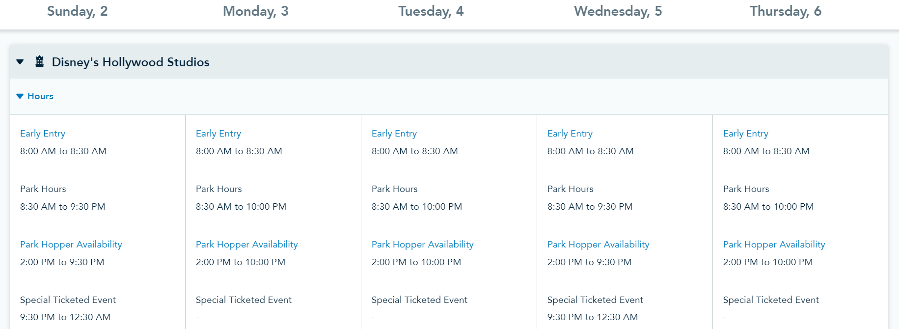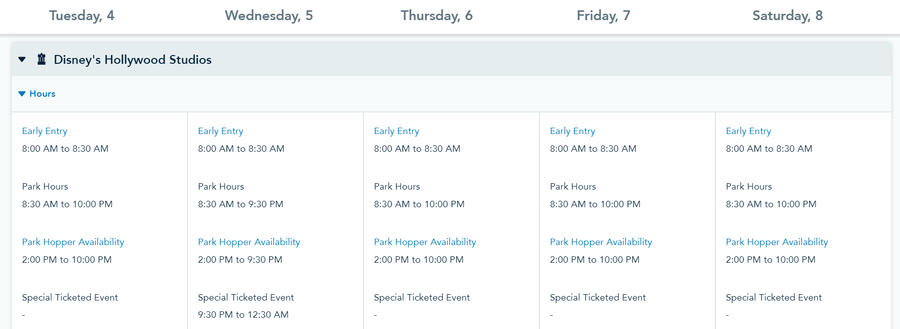 Hollywood Studios Park Hours