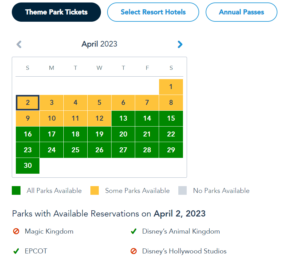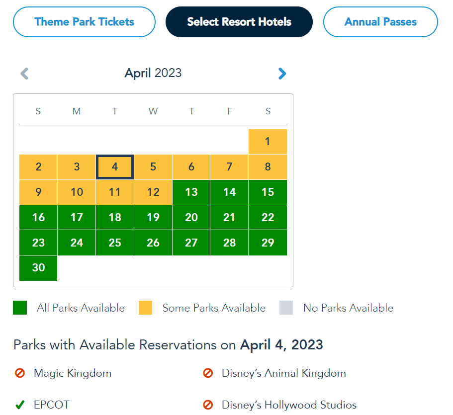 Park pass reservation availability is dependent on whether you’re a guest with theme park tickets, a Disney World hotel guest, or if you’re an Annual Passholder. For visitors with Theme Park Tickets, Magic Kingdom is sold out the entire week, Hollywood Studios is sold out for April 2nd-7th, and Animal Kingdom is sold out for April 3rd-4th. EPCOT is the ONLY park available every day of next week.