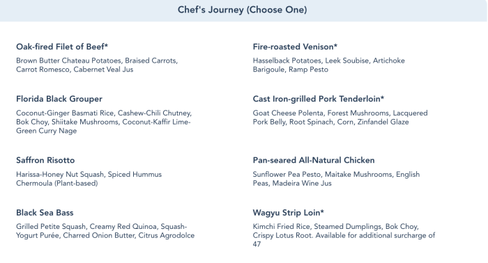 The main course, aka Chef’s Journey, will allow a selection of one of eight different options, including steak, risotto, seafood, and chicken.