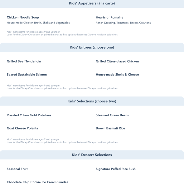 The kids’ menu allows children to choose an appetizer, one entrée, two selections (sides), and a dessert.