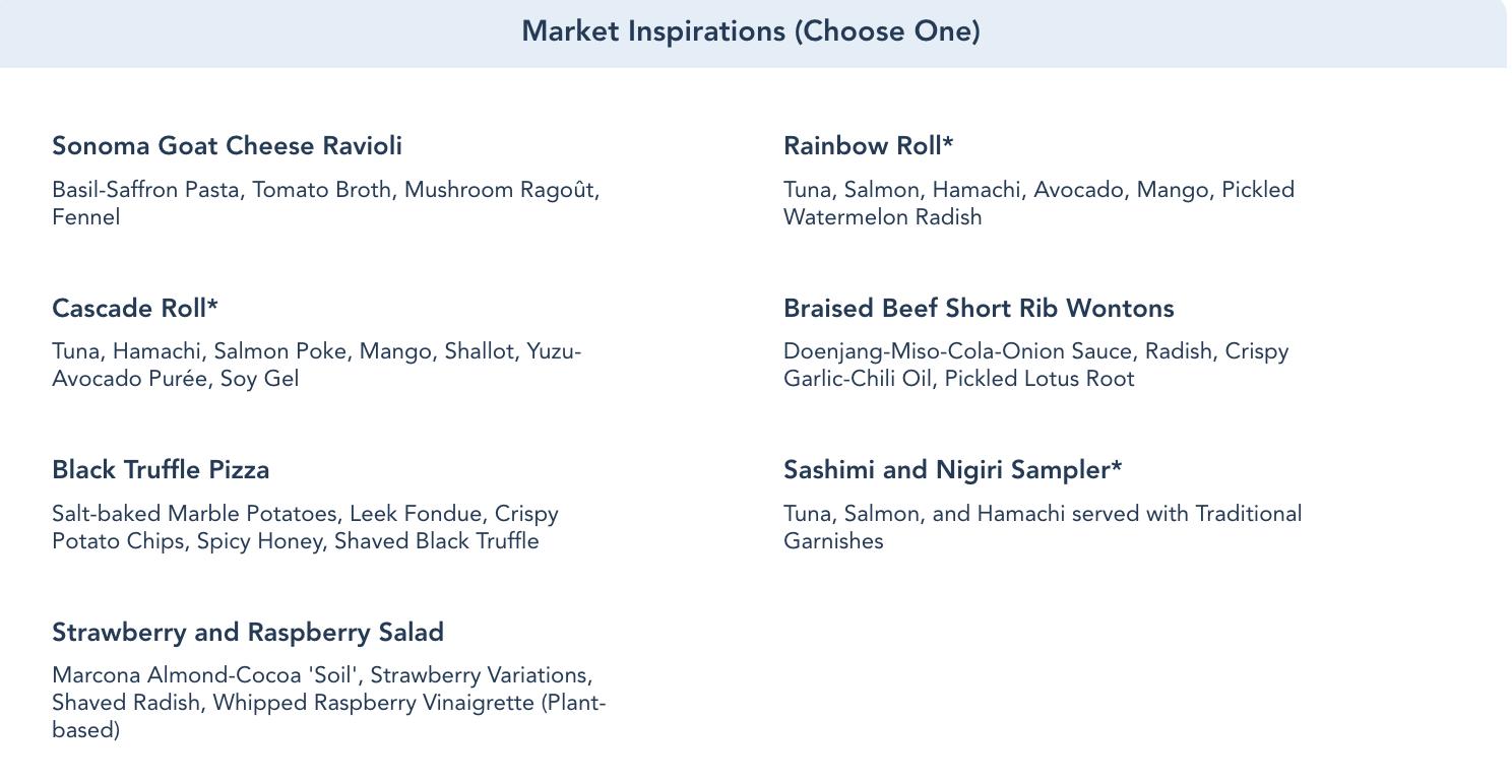 For starters, diners can choose one of seven different Market Inspiration options. You can choose between sushi, a salad, short rib, and more!