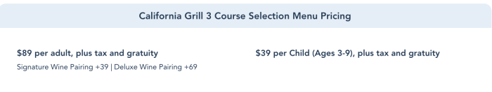 Now that the 50th anniversary celebration is over, the 50th anniversary menu at California Grill is gone. We knew the menu would be getting an overhaul, and now that new menu is available. The menu is still prix fixe and costs $89 for adults $89 (with signature wine pairings available as add-ons for an additional cost) and $39 per child.