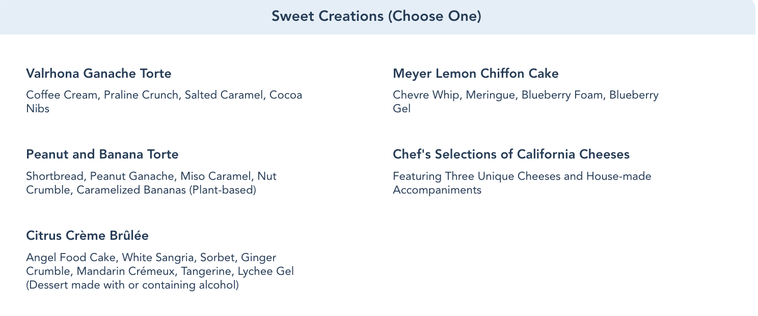 For dessert, there are five different Sweet Creations to choose from, including tortes, crème brûlée, cake, and cheeses.
