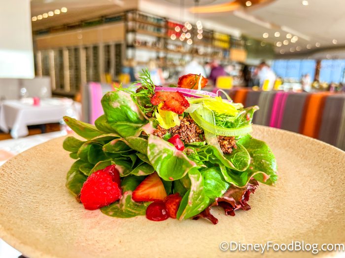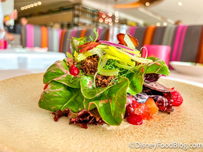 The other appetizer we ordered was the Strawberry and Raspberry Salad. And in all honesty, it was one of the BEST salads we’ve ever eaten. This plant-based dish is made with Marcona almond-cocoa ‘Soil’, strawberry variations, shaved radish, and whipped raspberry vinaigrette.