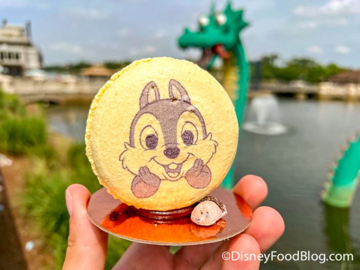 In honor of Chip ‘n’ Dale’s 80th birthday, you can grab a Chip ‘n’ Dale Macaron for a limited time at Amorette’s for $6. This is a Macaron Shell filled with Chocolate Chip Cookie Dough and Dark Chocolate Ganache with Crispies — one side has an image of Chip, while the other has an image of Dale.