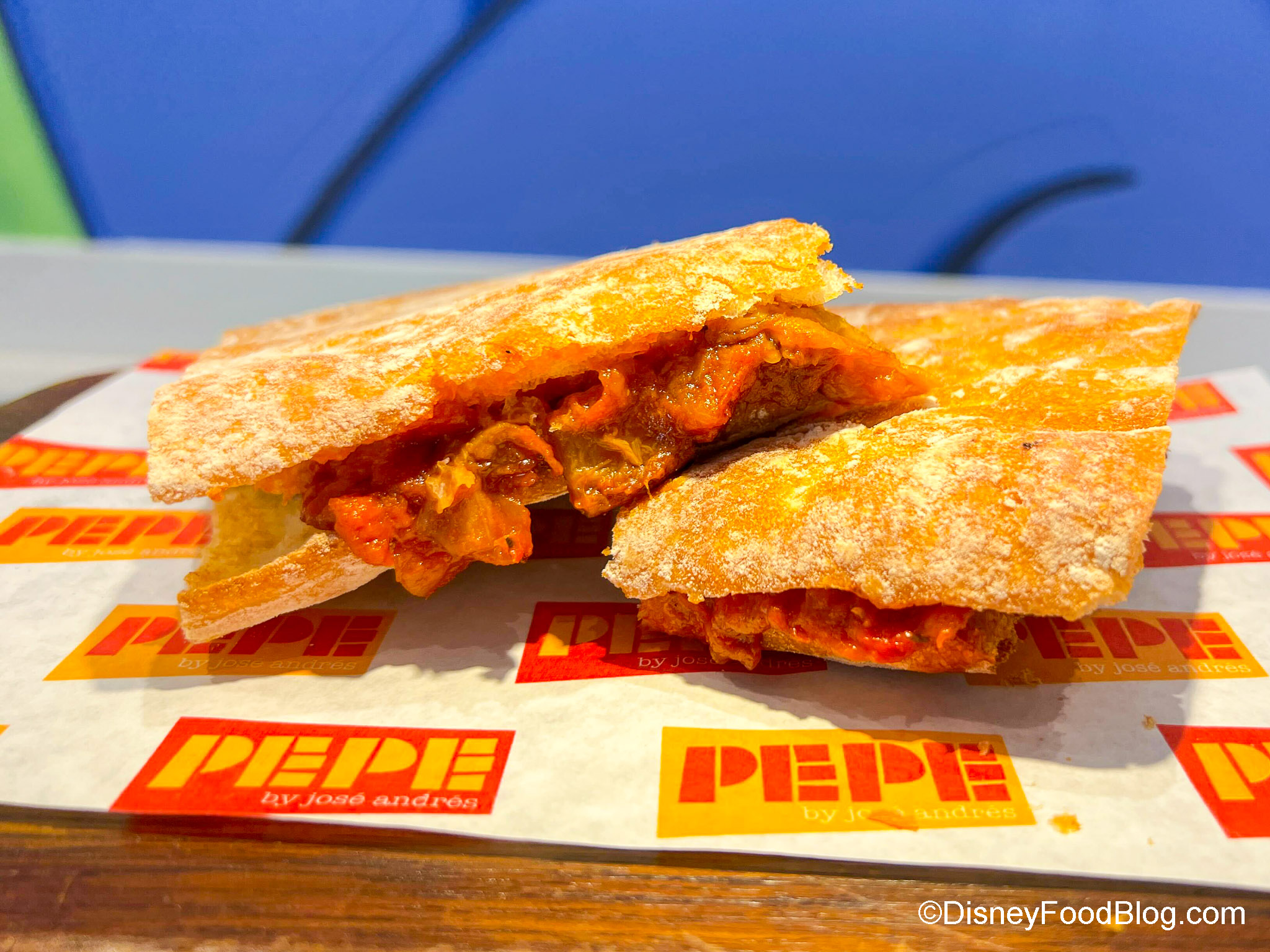 A new sandwich is here! The Bikini de Pisto con Queso Manchego Sandwich for $12, is made with onion, zucchini, red pepper, eggplant, and manchego cheese pressed between two slices of bread. When we got it, though, we made it vegan by skipping the cheese.