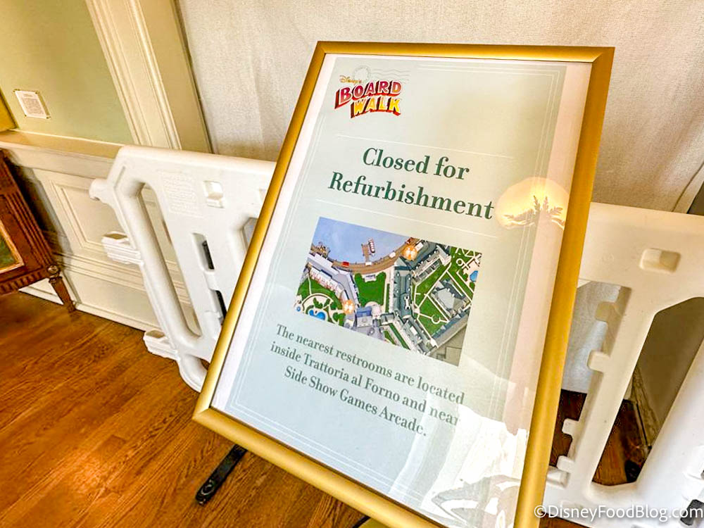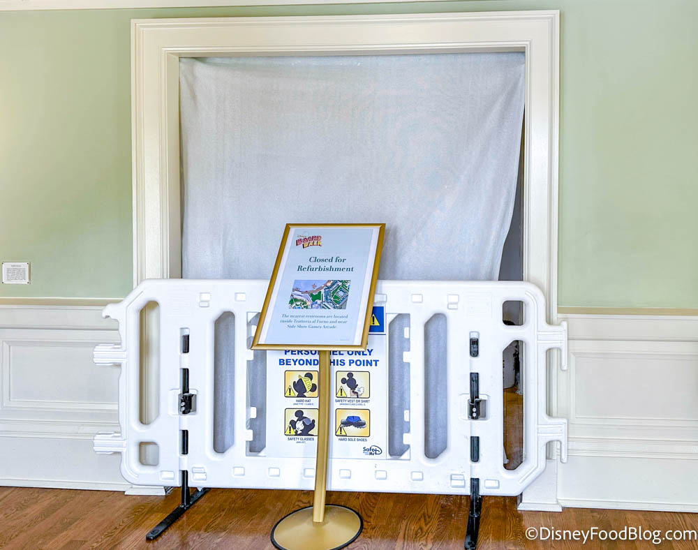 For quite a while now, the restrooms near the BoardWalk Inn lobby have been under construction. They’re blocked by small construction partitions and a plastic covering.