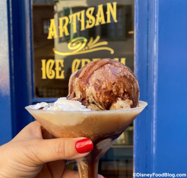 It’s difficult to choose from the long list of frozen drinks in EPCOT! So, venture with us to the France Pavilion where we’ll line up at the popular L’Artisan des Glaces for an Ice Cream Martini! This ice cream shop is a hidden gem. In fact, you’ll need to head to the back and over to the left side of the France pavilion to spot it.