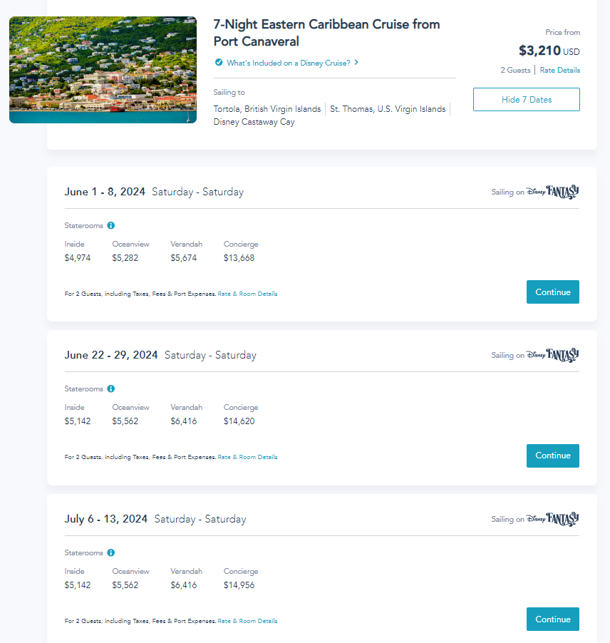 The gap between the Inside Stateroom and Concierge Level stays fairly balanced for these Caribbean cruises.