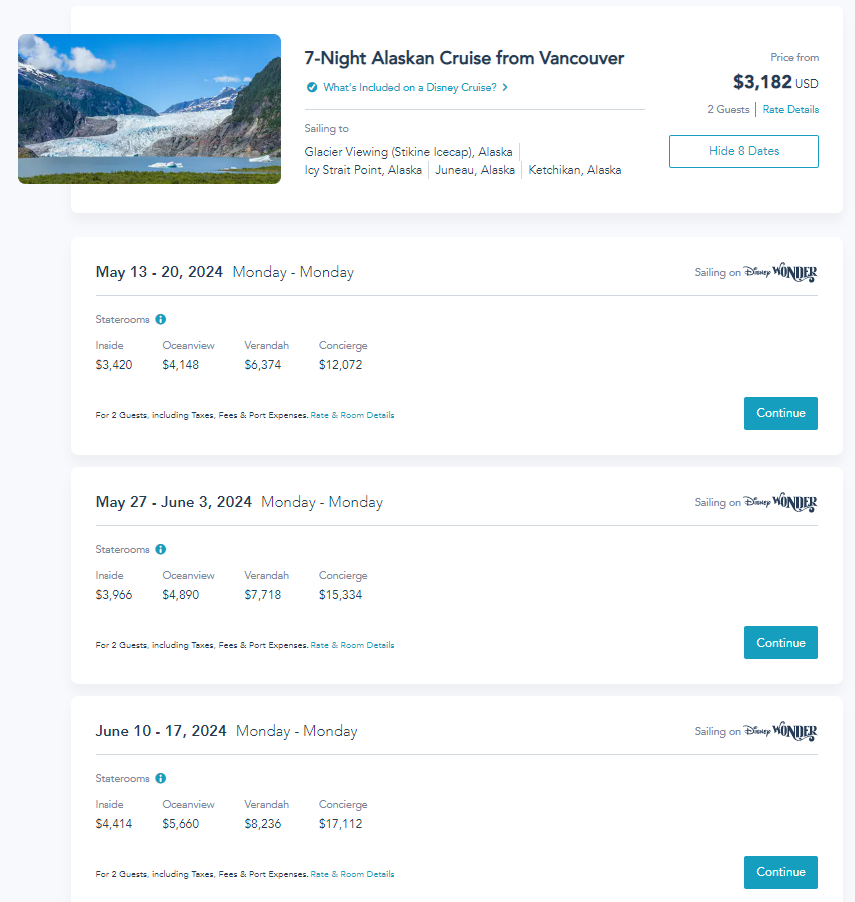 Prices for options on the Disney Wonder going to Alaska may be some of the biggest price differences you’ll see.