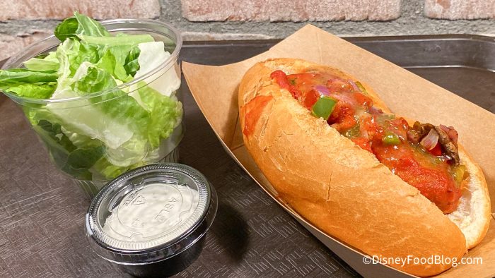 We ordered the Spicy Italian “Sausage” Sub with a side salad with vegan ranch dressing.